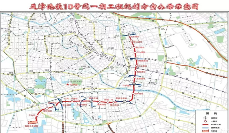 天津地鐵10號(hào)線為城區(qū)西南至東北方向的軌道交通骨干線,南起西青區(qū)梨園頭,最終進(jìn)入北部新城地區(qū),全長(zhǎng)43.2公里。地鐵10號(hào)線南段工程由梨園頭至嶼東城,從衛(wèi)國(guó)道途經(jīng)沙柳路、天鋼柳林、珠江道、麗江道、梅江至梨園頭車(chē)輛段,線路全長(zhǎng)約21公里,其中地下線20.3公里,過(guò)渡線及地面線0.7公里,共設(shè)21座車(chē)站(20個(gè)地下站,1個(gè)地面站),設(shè)梨園頭車(chē)輛段,與地鐵1、2、4、5、6號(hào)線換乘。